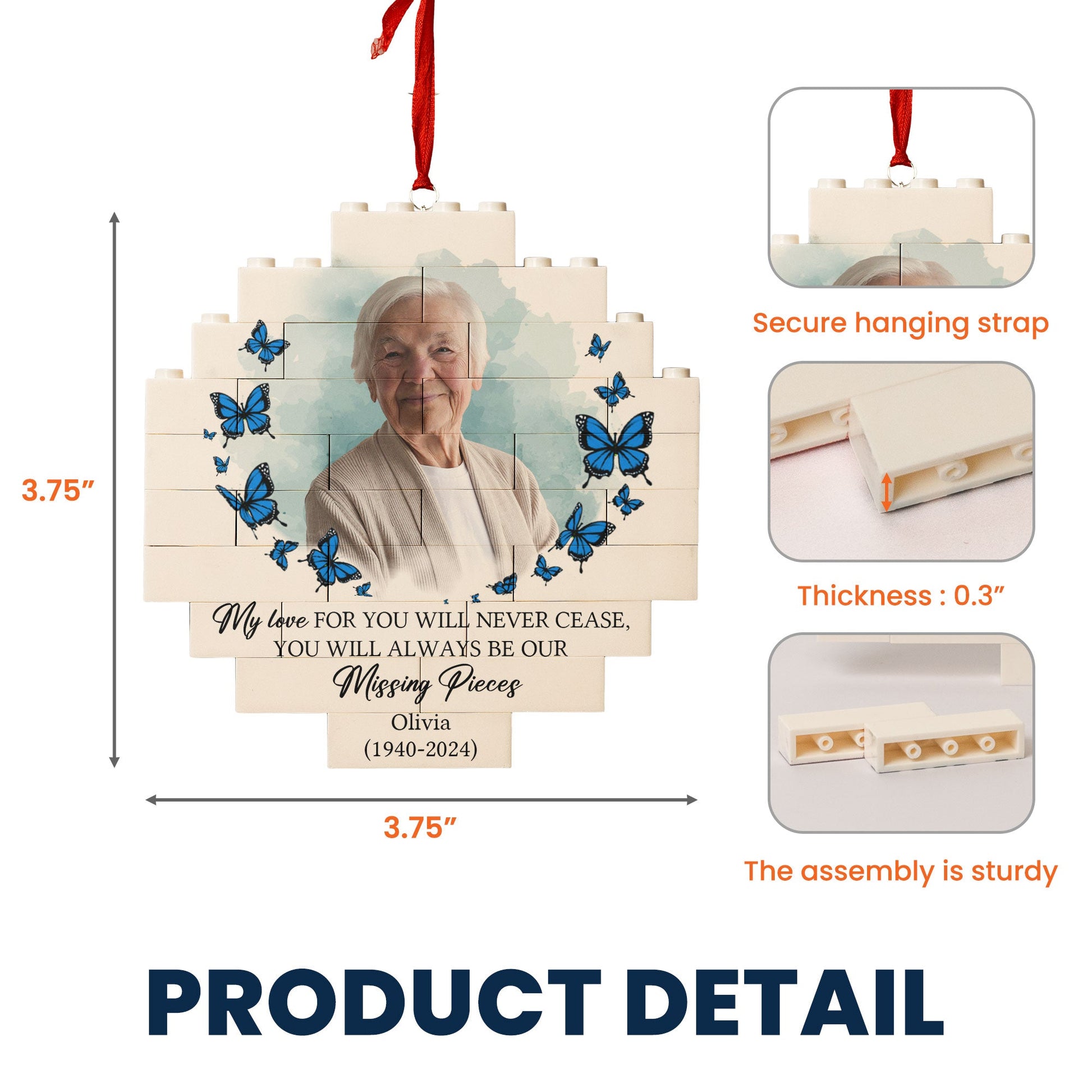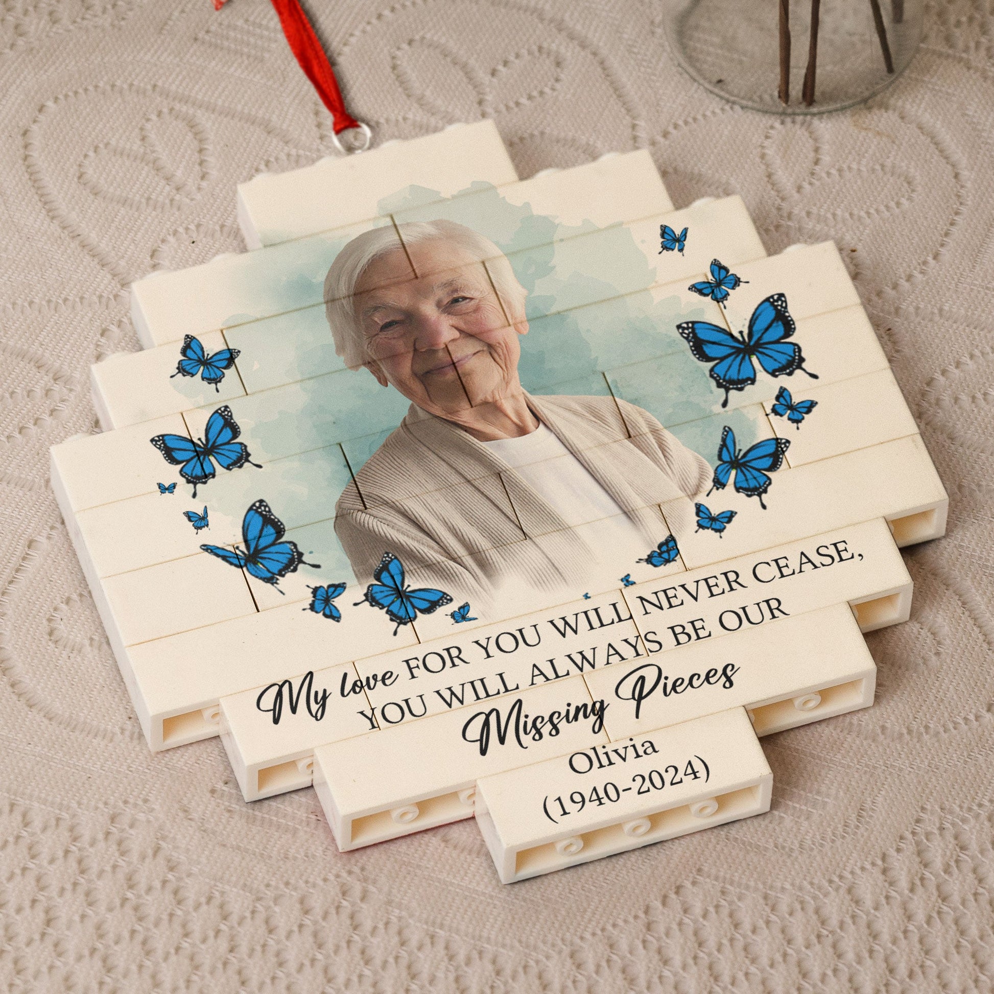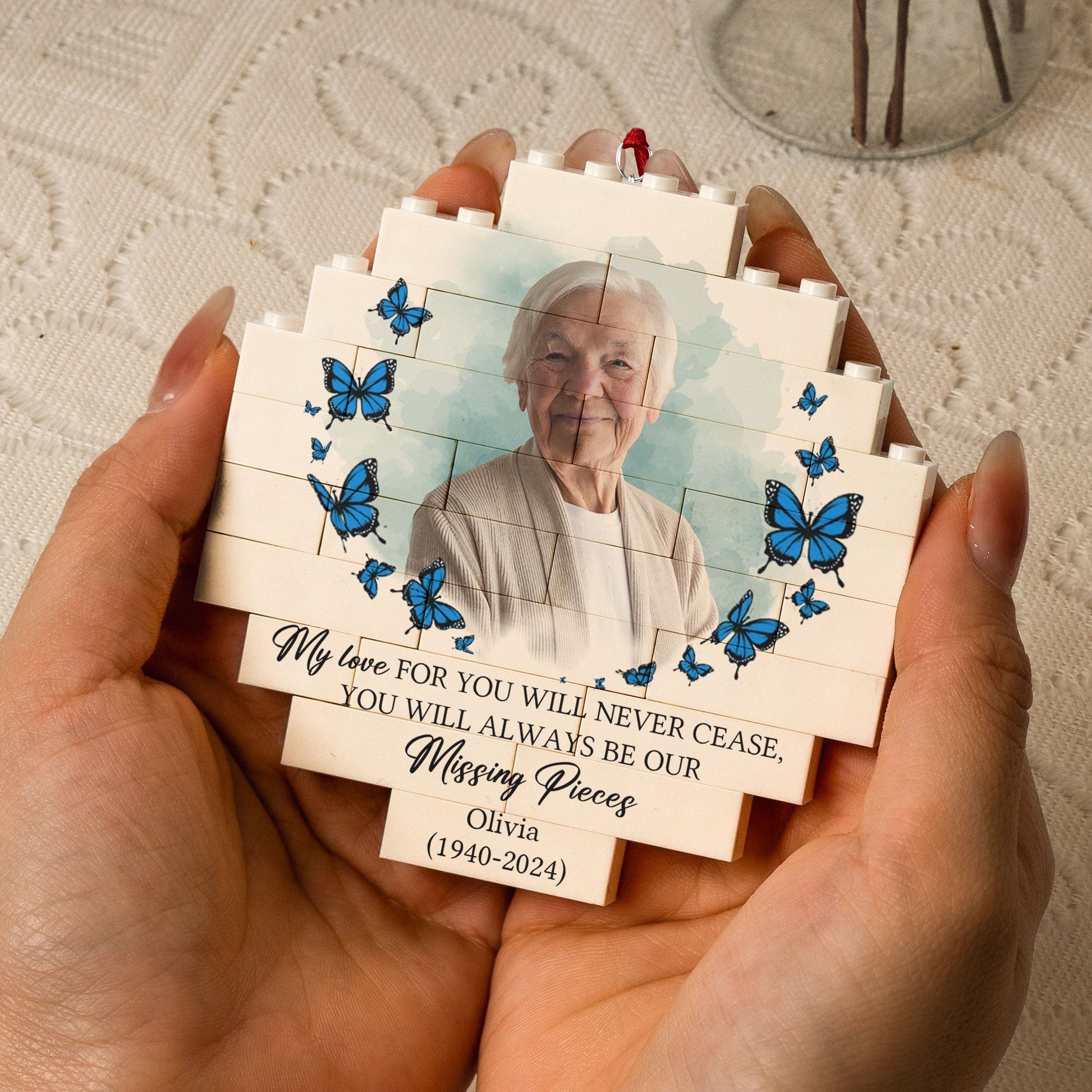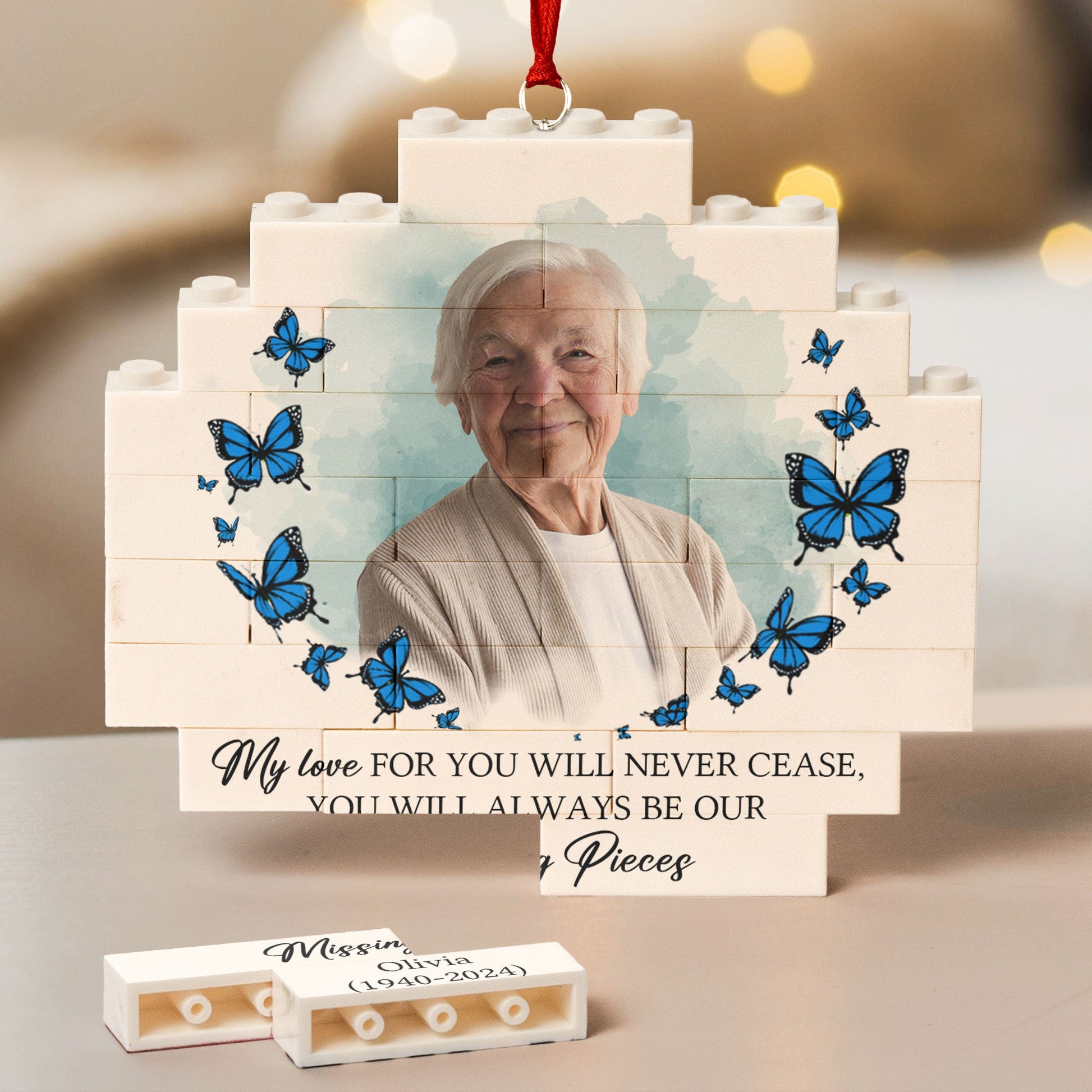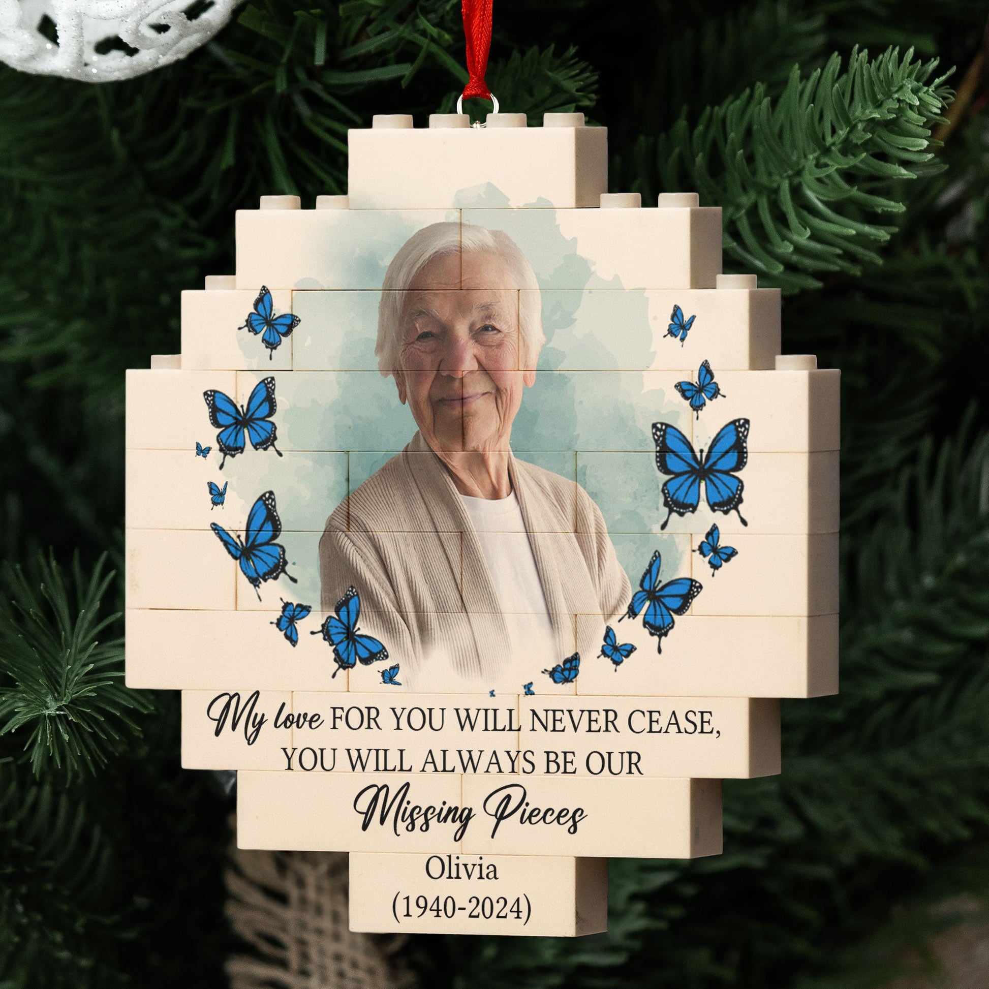 You Will Always Be My Missing Piece - Personalized Buildable Christmas Photo Ornament is a heartfelt memorial gift designed to honor the memory of a loved one. This personalized memorial ornament allows you to customize it with a photo of your mom or another special person you've lost, creating a beautiful keepsake to hang on the Christmas tree. The unique puzzle design can be assembled as a touching reminder of the piece that will always be missing but forever cherished in your heart. Ideal as a sympathy gift, remembrance gift, or a way to honor a lost loved one during the holidays, this ornament brings comfort and serves as a lasting tribute to the memories shared.