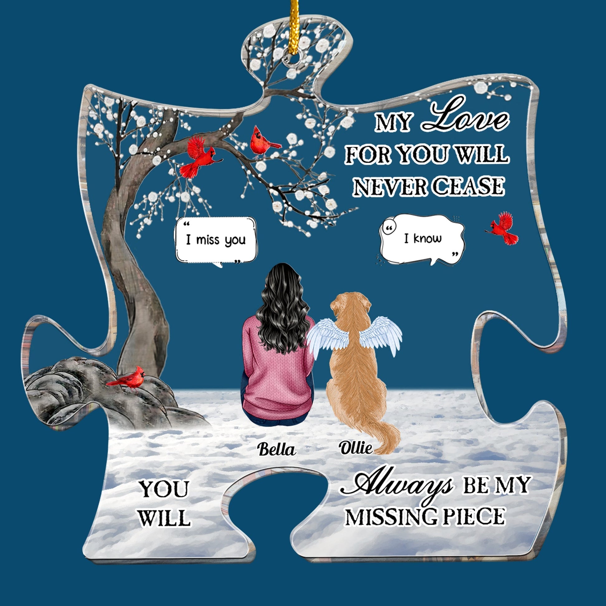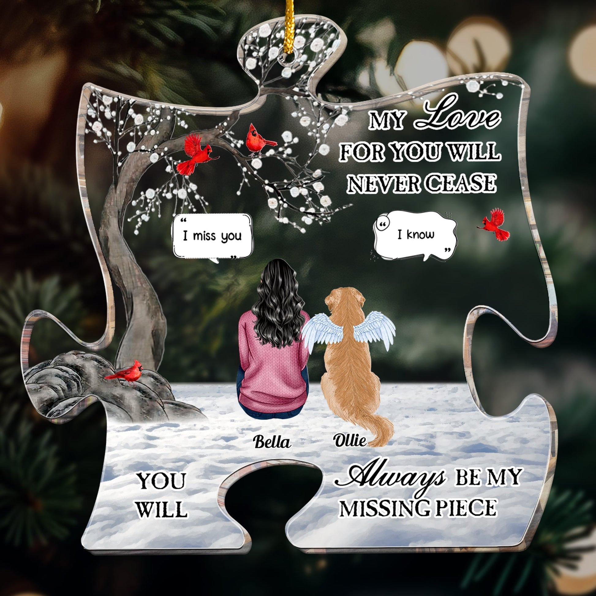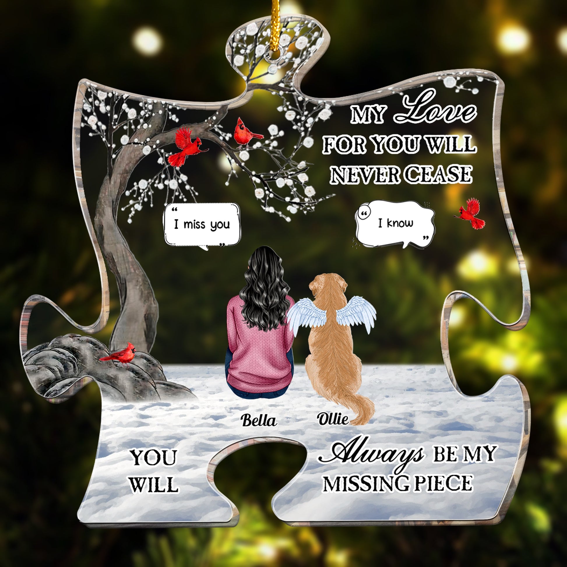 This personalized puzzle shape acrylic ornament is a great gift for the person who has lost their pet. The ornament is shaped like a puzzle piece, perfect for those who have lost their missing piece. The engraving reads: "My love for you will never cease. You will always be my missing piece."